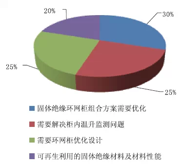 在固體絕緣環(huán)網(wǎng)柜規(guī)劃中,以為亟待解決的問題詳細(xì)有以下內(nèi)容,以為固體絕緣環(huán)網(wǎng)柜組合方案需要優(yōu)化的占比30%;需要解決柜內(nèi)溫升監(jiān)測問題的占比25%;需要環(huán)網(wǎng)柜優(yōu)化規(guī)劃的占比25%;可再生利用的固體絕緣資料及資料功能的占比20%。如圖10所示。