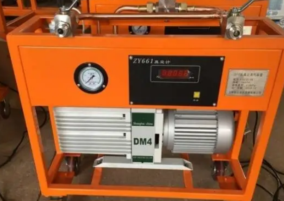 該進程的作用是將罐體(柜體)內(nèi)空氣抽出,要求極限真空度10Pa,采用的設(shè)備是抽真空補氣設(shè)備(抽真空補氣小車),該設(shè)備配置的主要技術(shù)參數(shù)是: