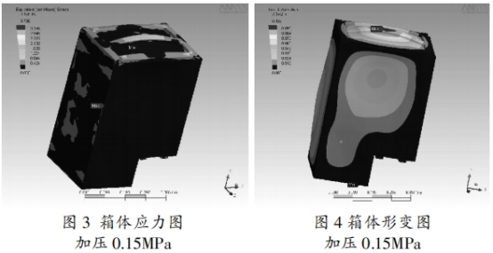 箱壁厚度滿(mǎn)足資料的許應(yīng)應(yīng)力請(qǐng)求及氣箱允許變形量請(qǐng)求。經(jīng)過(guò)軟件剖析核算后得到氣箱的應(yīng)力散布(見(jiàn)圖3)及箱體形變(見(jiàn)圖4),終究找到氣箱壁厚。