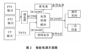 2.6智能電源環(huán)網(wǎng)柜的操作組織、操控器、通訊終端等二次設(shè)備都需求完畢不連續(xù)供電。為了行進(jìn)供電的可靠性,請求在供電電源失電時,二次回路仍然會有電源,能夠持續(xù)可靠的動作,環(huán)網(wǎng)柜中有必要具有備用電源。為了行進(jìn)供電電源的可靠性本電源的規(guī)劃首要選用了如下辦法:(1)環(huán)網(wǎng)柜普通選用雙進(jìn)線,兩條進(jìn)線互為備用給電源的充電模塊供電,當(dāng)其中一條進(jìn)線失電時,由繼電器將另一條進(jìn)線的220V電源轉(zhuǎn)給充電模塊,保證整個柜子的二次回路持續(xù)供電。(2)當(dāng)環(huán)網(wǎng)柜的兩條進(jìn)線都失電的時分,為了使二次回路持續(xù)帶電,需求由備用電源持續(xù)供電。如今首要的備用電源是不連續(xù)電源(UPS)和蓄電池,還有的選用超級電容供電。為了行進(jìn)供電的可靠性,本電源方案選用蓄電池與超極電容相分離,兩種電源可互為備用,能夠進(jìn)一步行進(jìn)供電的可靠性。智能電源的方案如圖2所示。