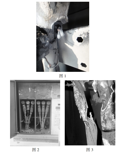 2008年3月24日,回南天,富灣站富油乙線速斷跳閘,位于戶外的一臺(tái)電纜分支箱產(chǎn)生短路爆破(如圖1),601開關(guān)出線電纜倉門嚴(yán)峻熏黑,翻開后發(fā)現(xiàn)A相電纜終端應(yīng)力錐焚毀,纜芯熔損,初步剖析主要為施工工藝粗糙,構(gòu)成電纜終端電場(chǎng)畸變嚴(yán)峻,一起纜身緊靠固定用金屬支架,在箱內(nèi)潮濕環(huán)境下產(chǎn)成長(zhǎng)時(shí)刻閃絡(luò)放電,畢竟絕緣破損接地短路,將出線套管炸壞,構(gòu)成氣室漏氣,分支箱報(bào)廢。