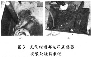 檢查35kV垣潔線56號線路電壓互感器上端柜頂,發(fā)現(xiàn)柜頂插拔處燒損,斷路器室壓力開釋設(shè)備動作。將壓力開釋通道翻開后,發(fā)現(xiàn)本柜斷路器室壓力開釋盤動作,壓力開釋通道有許多燃弧噴出的落塵。翻開斷路器室入孔后,發(fā)現(xiàn)氣室內(nèi)有燃弧痕跡。氣室內(nèi)其它絕緣件未受損,銅排和充氣柜柜體表面有落塵無燒傷痕跡,如圖3所示。