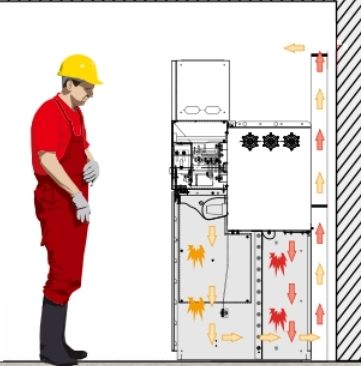 壓力經(jīng)過后部通道上部釋放出來,氣流出來后沿著箱頂部走,氣流已經(jīng)過長(zhǎng)距離的活動(dòng),燃燒火焰及沖擊力已明顯減小,對(duì)設(shè)備和人員的傷害較小,防止釋放到電纜溝對(duì)電纜的損壞,或氣箱電弧壓力直接從頂部釋放到開關(guān)室頂部反彈,直接損傷柜前人員,或反彈進(jìn)一步燒損其它設(shè)備。