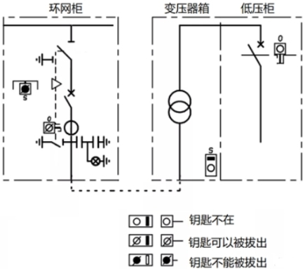 如圖7所示,環(huán)網(wǎng)箱內(nèi)部,阻隔/接地開關(guān)與電纜室門之間的鑰匙聯(lián)鎖,電纜室蓋板翻開后,鑰匙被肯定,不能拔出刺進(jìn)到阻隔開關(guān)鎖,即不能操作接地開關(guān);只需蓋板合上,鑰匙才氣拔出,去操作接地開關(guān)分閘。而體系視點(diǎn),只需接地開關(guān)合閘,鑰匙才氣被取出,去開變壓器箱的門,完畢變壓器檢修,一同低壓斷路器不能合閘。