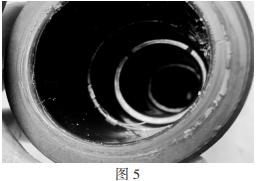 事端分支箱電纜終端所運用的硅脂密封功用不良,故障發(fā)生后,當(dāng)拆撥其它兩相電纜頭時,由于硅脂出現(xiàn)干燥粘結(jié)(如圖5),需求多人合力才調(diào)撥出,可見硅脂已不能起到潤滑防潮與絕緣的效果,不能與電纜頭同“呼吸”,彈性功用大為下降。