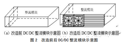 (1)在裝置功率元件一側(cè)加裝散熱片,并于散熱片上面裝設常規(guī)風扇,從而擴大散熱面積,增強空氣流通,起到散熱降溫作用,如圖3所示改進前后示意圖。