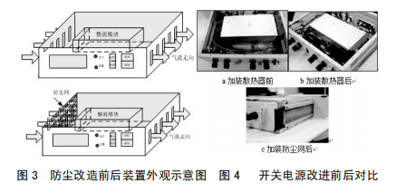 (2)在裝置本體進風孔加防塵網(wǎng),防止灰塵進入裝置內(nèi)部,設備維護人員定期對濾網(wǎng)進行清掃,從而減輕元器件表面覆塵,利于裝置正常散熱,如圖3所示加裝防塵網(wǎng)后開關電源示意圖。對裝置實施上述改進后,其改進前后對比如圖4所示。
